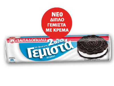 2πλοΓεμιστά Παπαδοπούλου: Απολαύστε τις 2 απίθανες γεύσεις με 2πλή γέμιση για 2πλή απόλαυση: 2πλοΓεμιστά Παπαδοπούλου με γεύση σοκολάτα και 2πλοΓεμιστά Παπαδοπούλου με κρέμα.